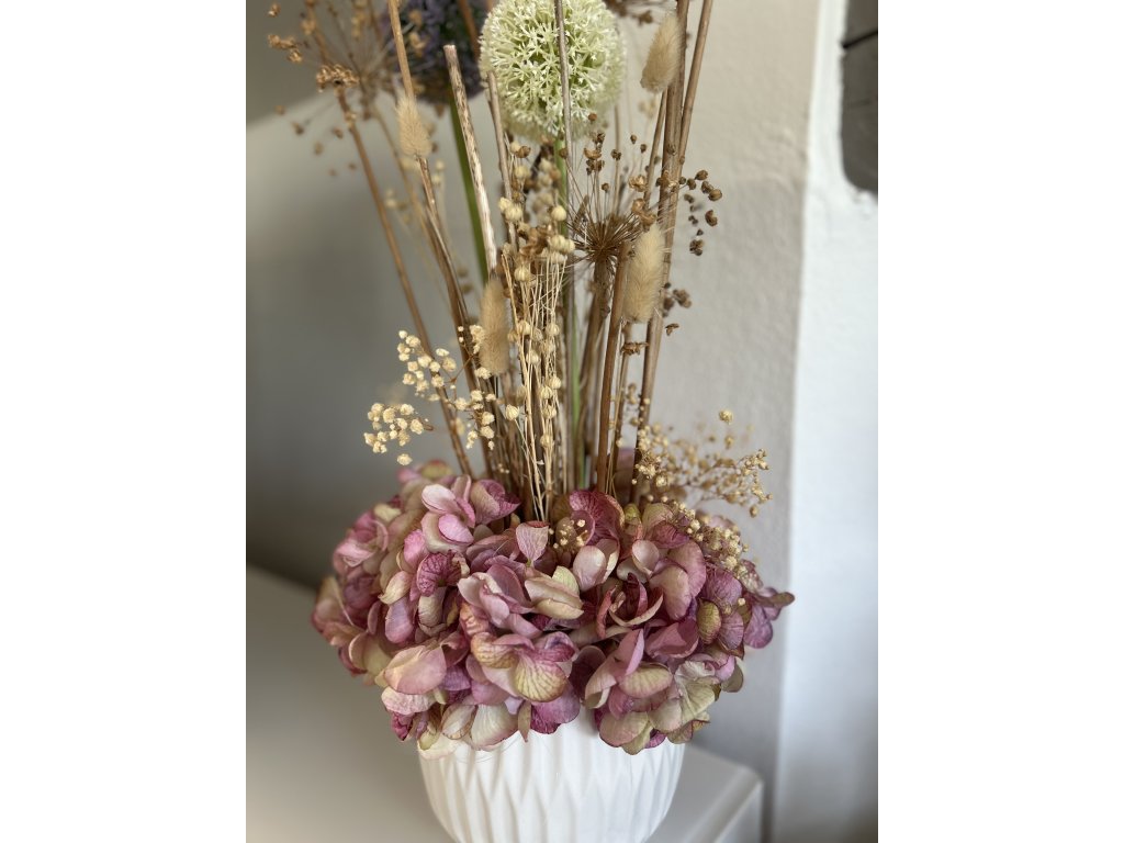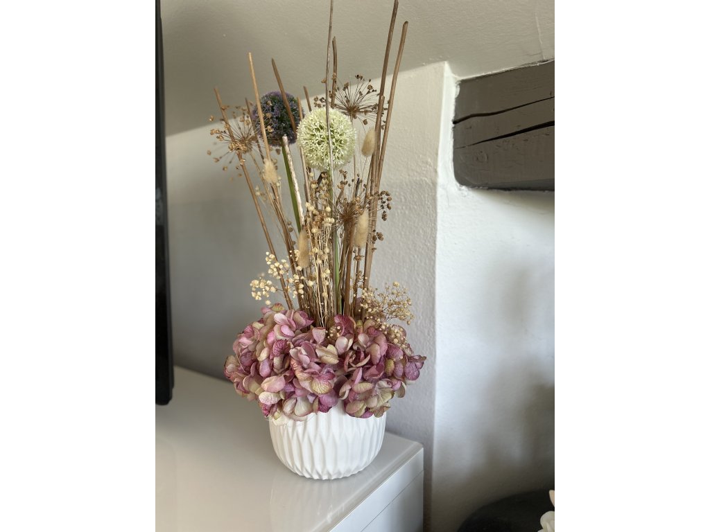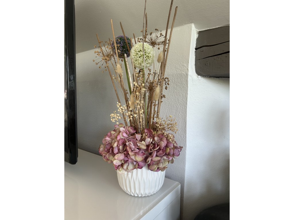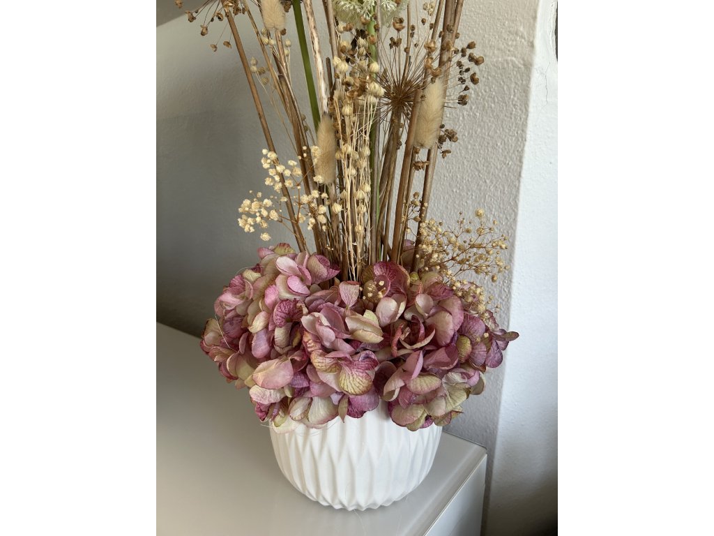Květináč vyrobený z umělých, sušených a stabilizovaných květin.