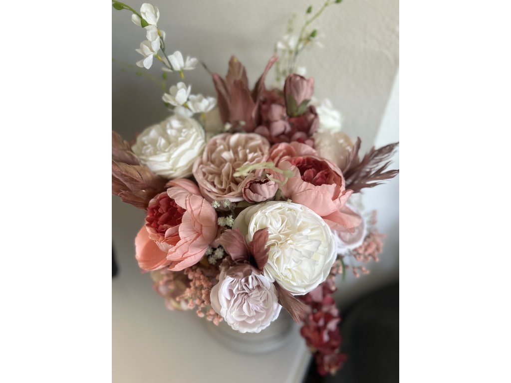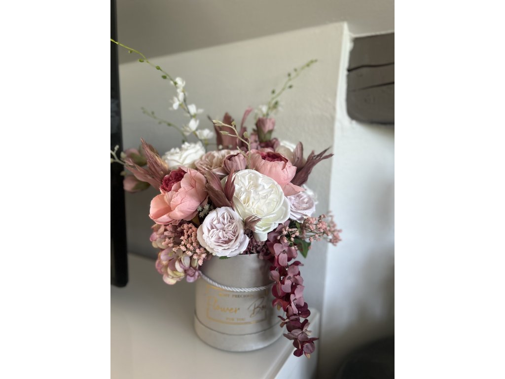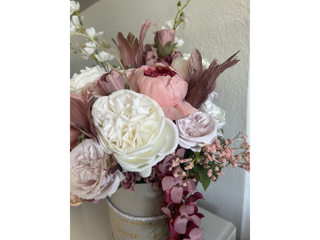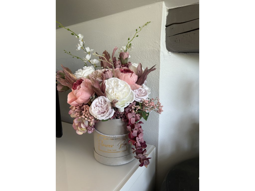 Flowerbox vyrobený z umělých květů v lehkých tónech růžové, bílé a tmavě růžové.