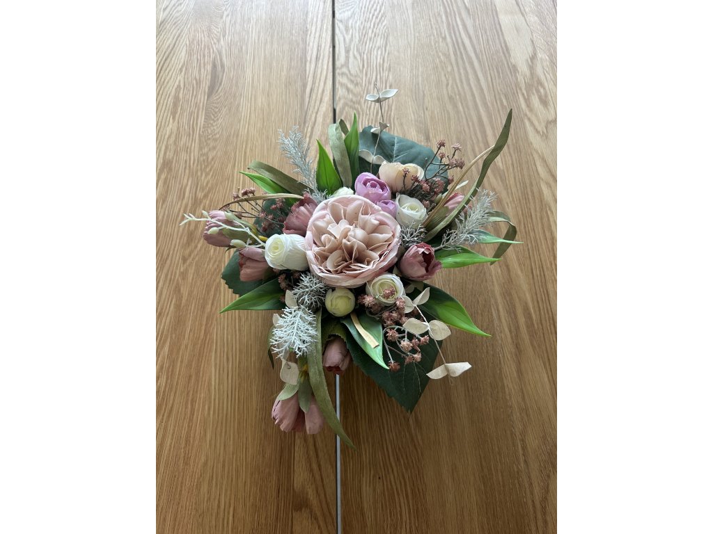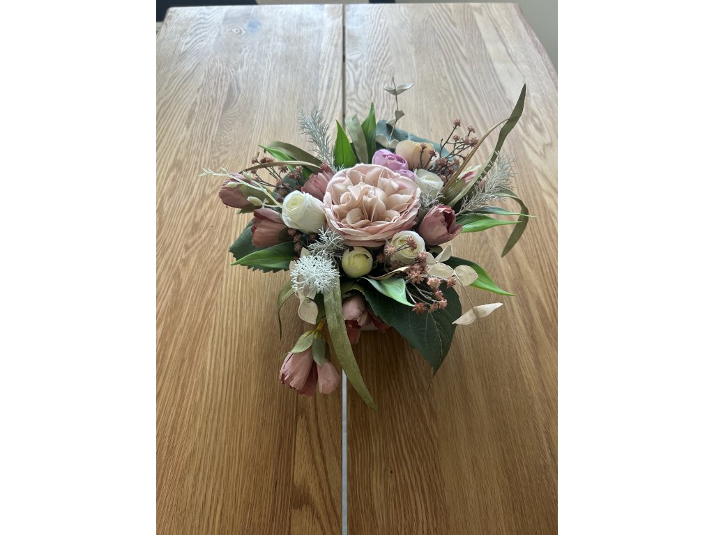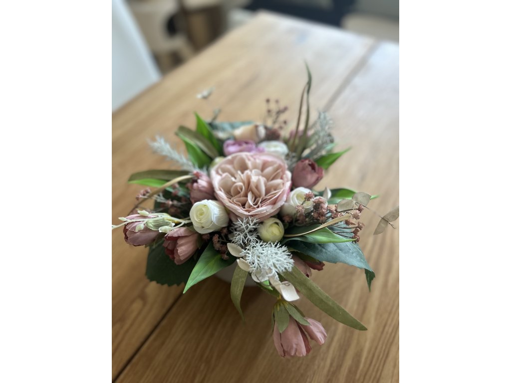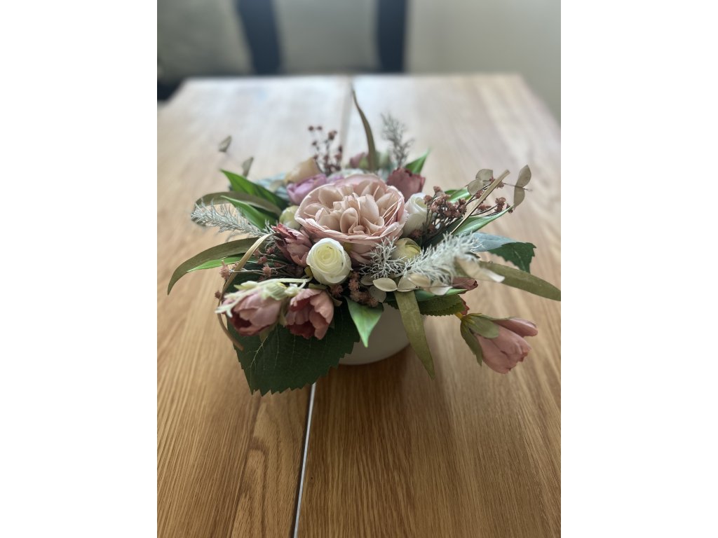 Ikebana na stůl z umělých květin v tónech růžové.