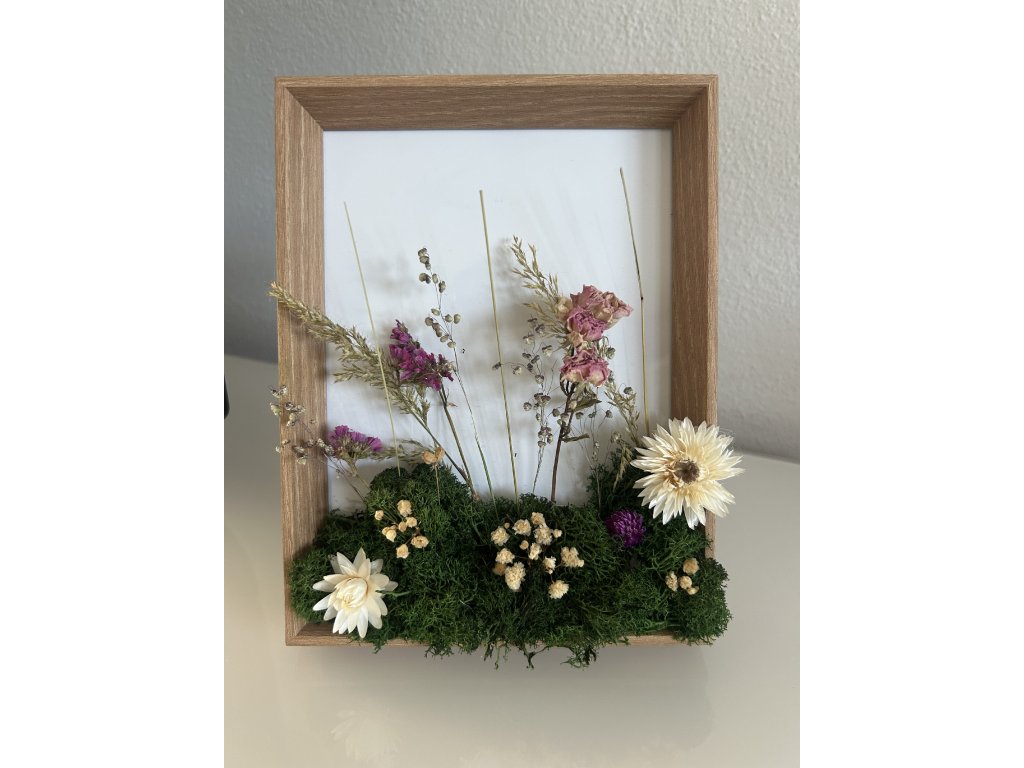 Květináč vyrobený z umělých, sušených a stabilizovaných květin. Obrázek vyrobený z květin sušených a stabilizovaných s kombinací stabilizovaného mechu.