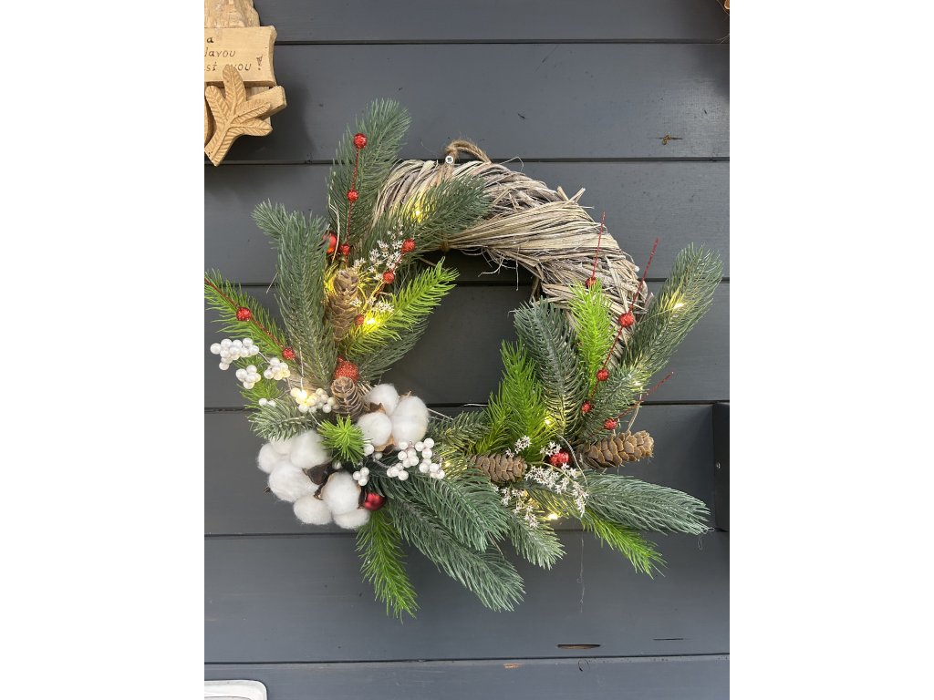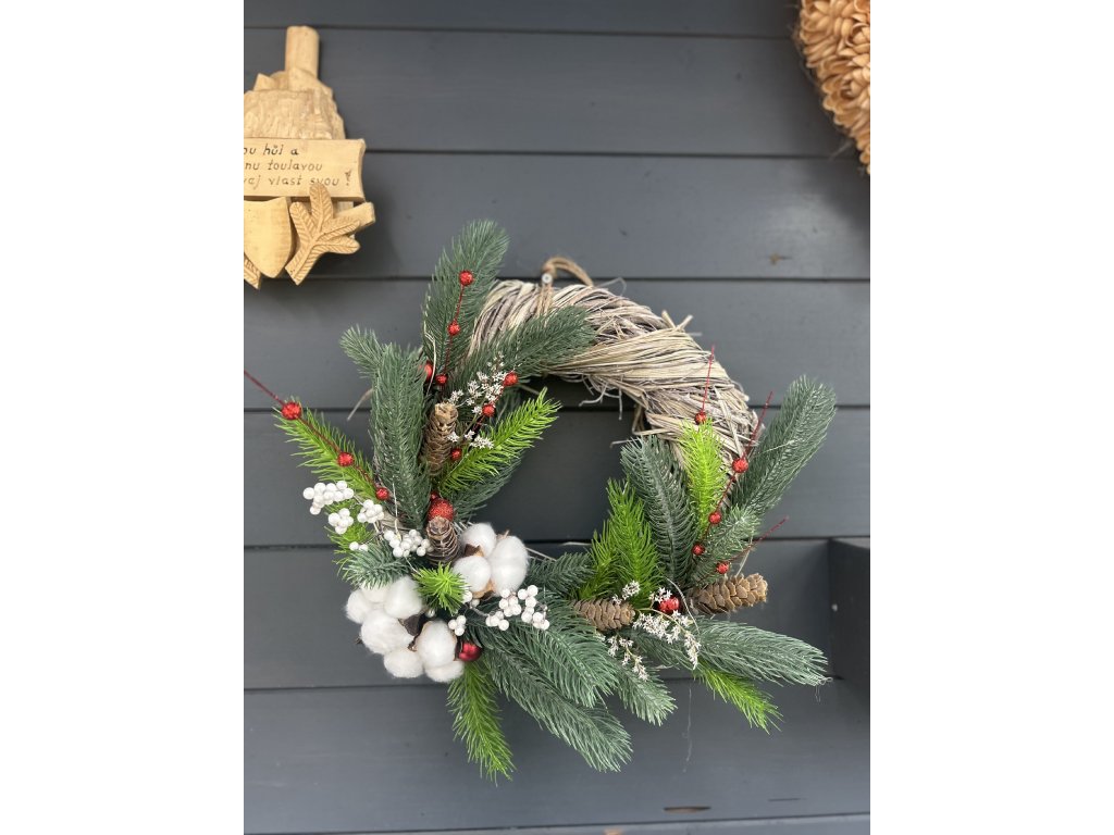 Věnec vyrobený z umělého vánočního chvojí v tónech bílo-červené spolu se větýlky, která jde zapínat a vypínat.